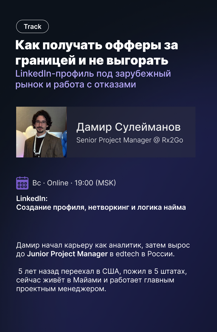 Сопровождаем выход на международный рынок: LinkedIn и CV по стандартам, коммуникация с рекрутерами и подготовка к интервью.